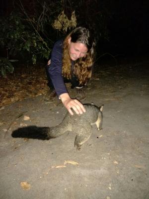 Die Koreaner kreischen und wedeln rum. Das Opossum scheißt neben das Tost auf den Tisch und wird mit einem beherzten Klapps von einer der Australischen Frauen vom Tisch geschmissen. Alle lachen sich tot. Das restliche Toast wird nun fair an alle Opossums verteilt, denn es tauchen immer mehr auf. Die meisten von ihnen sind scheu aber eines kommt immer wieder zu mir und ich kann es sogar streicheln. Ein klasse Gefühl.